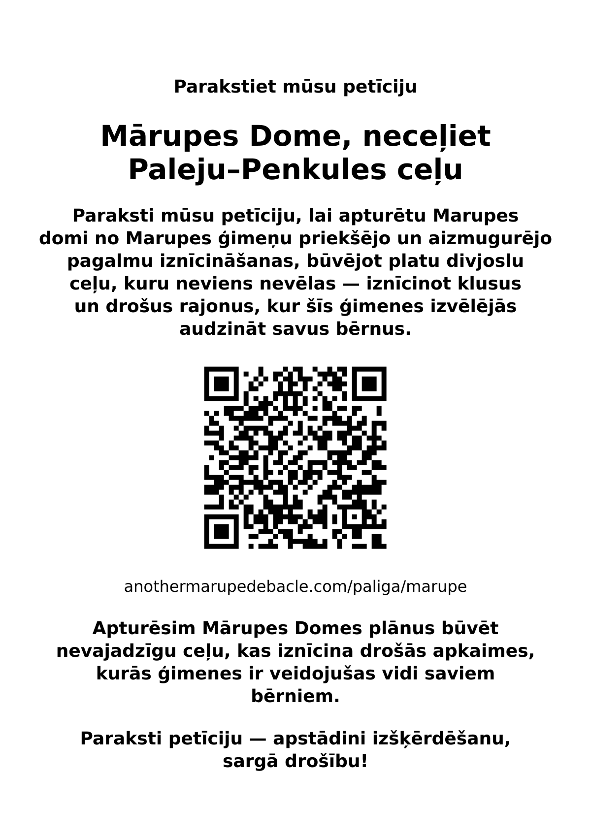 Paraksti mūsu petīciju, lai apturētu Marupes domi no Marupes ģimeņu priekšējo un aizmugurējo pagalmu iznīcināšanas, būvējot platu divjoslu ceļu, kuru neviens nevēlas — iznīcinot klusus un drošus rajonus, kur šīs ģimenes izvēlējās audzināt savus bērnus.
